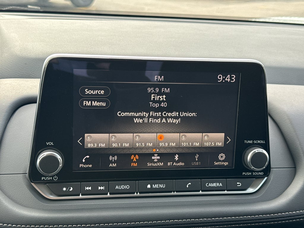 - Radio: AM/FM NissanConnect -inc: 6 speakers plus 2 tweeters, Apple CarPlay, Android Auto, 8" color touch screen display, Bluetooth®, 2 front USB type-C, Wi-Fi hotspot and NissanConnect Services powered by SiriusXM